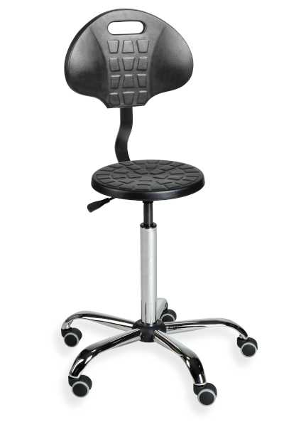 This is a polyuretane stool, highly resistant to chemicals. Ideal for all industrial applications, including workshops and factories using chemicals (oil, grease, water). Material: polyurethane foam. Version with backrest. Option: castors.